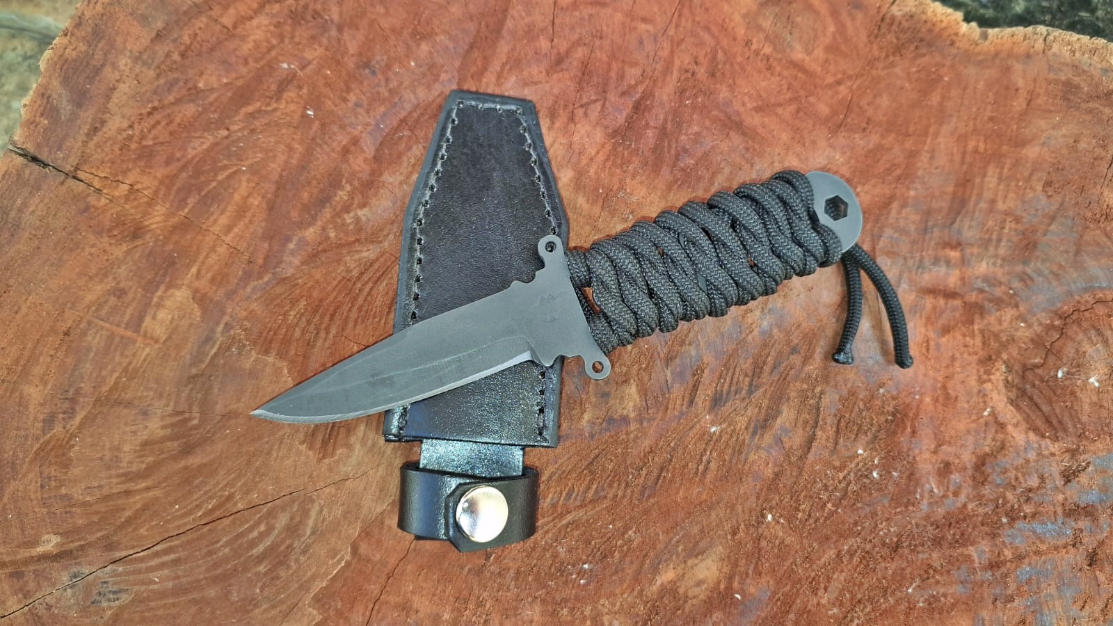 A DEF 3 B possui uma bainha em couro bovino, permitindo ela ser transportada com segurança, sua empunhadura é confecionada em paracord, permitindo ele ser usado quando necessário.
